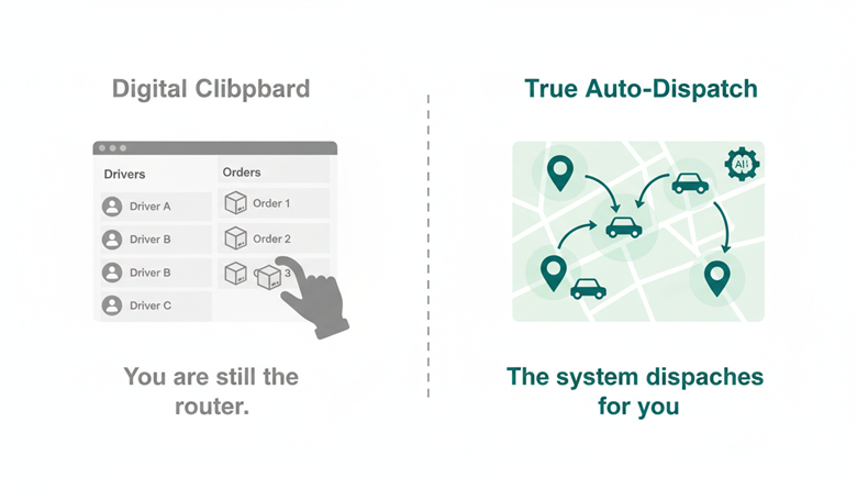 Generic dispatch tools treat your operation like a taxi service. They give you a list of drivers and a list of orders, then leave you to play matchmaker.