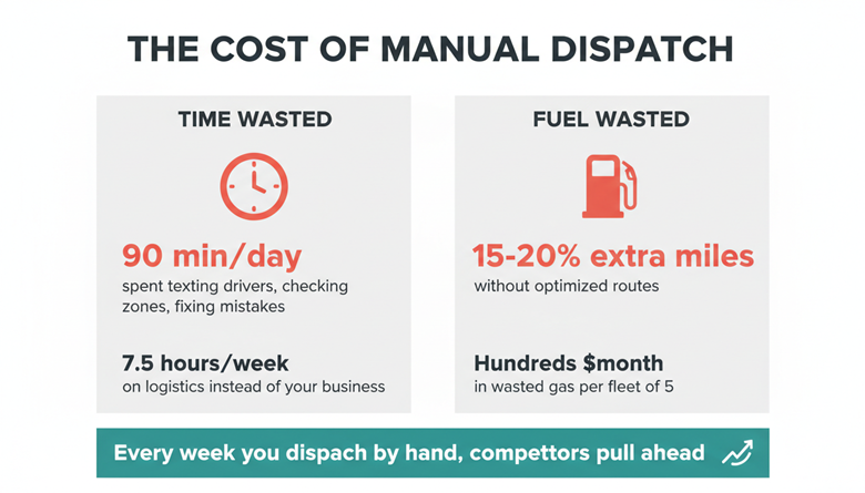 Fuel costs compound the problem. Without optimized routes, drivers cover 15-20% more miles than necessary. On a fleet of five drivers, that is hundreds of dollars in wasted gas every month.